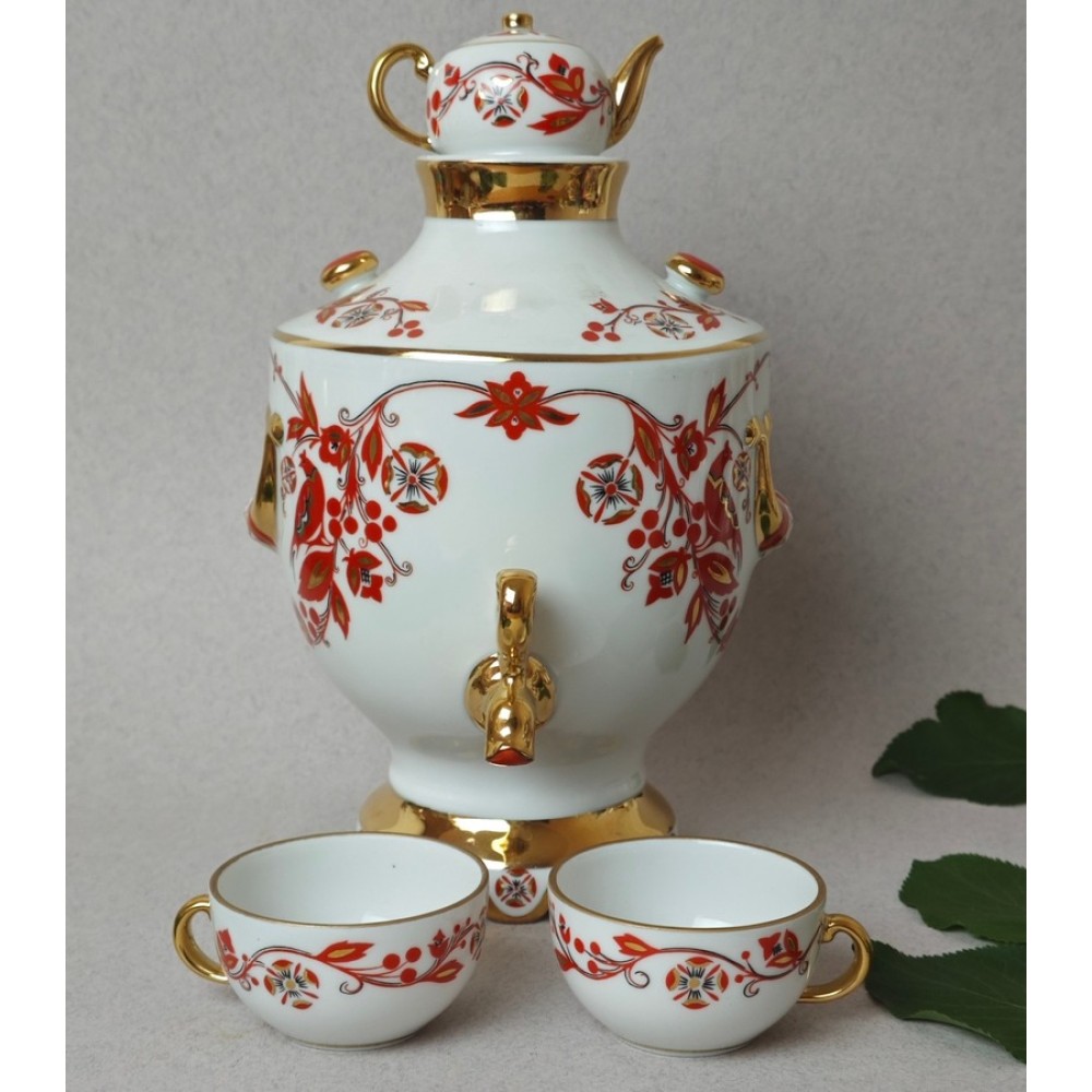 Russian Motifs Wine Set, "Cheerful Samovar" form, LFZ, USSR porcelain.