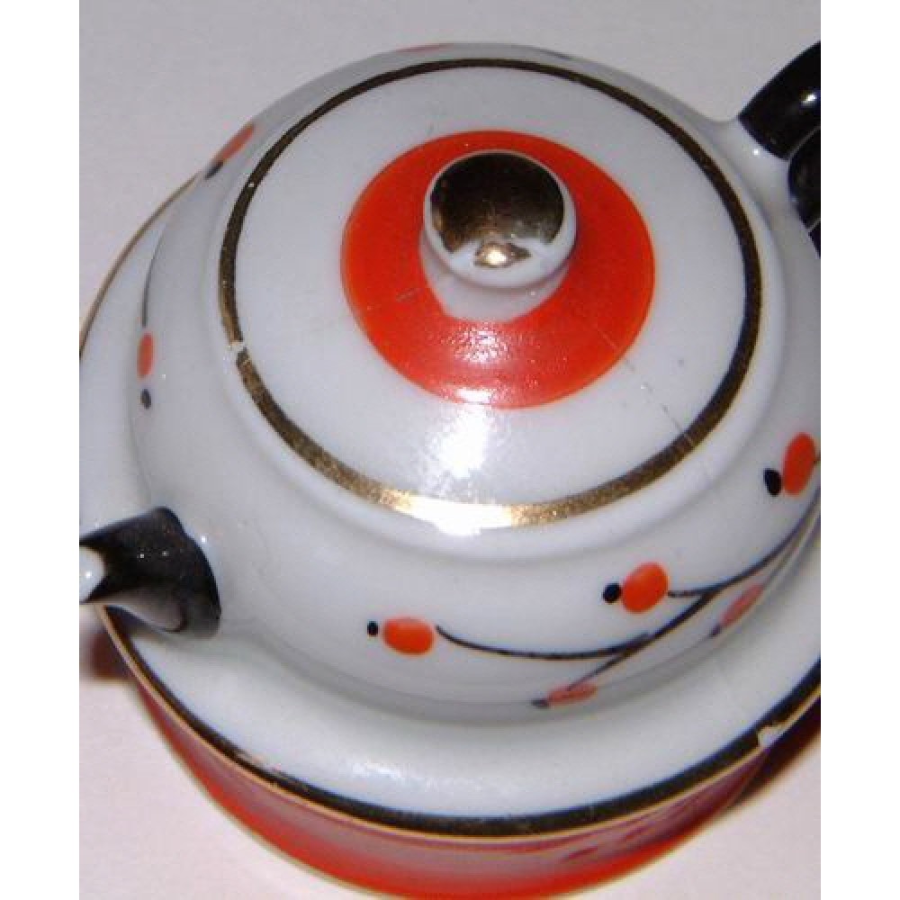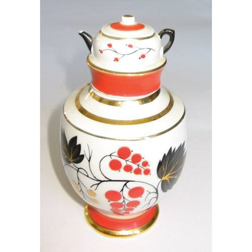It was made in the Lomonosov Porcelain Factory in Leningrad, Soviet Union. This pattern is named inch. Twig of Currant inch. , designed by A.Chshekatikhina, porcelain artist. It has a Samovar shape, designed by E.Krimmer, porcelain sculptor. It was hand-painted with 22 Karat Gold Ink. 6 1/8inch. tall. It has a factory logo on the bottom. It is in excellentcondition, but the lid was broken and glued - see picture.