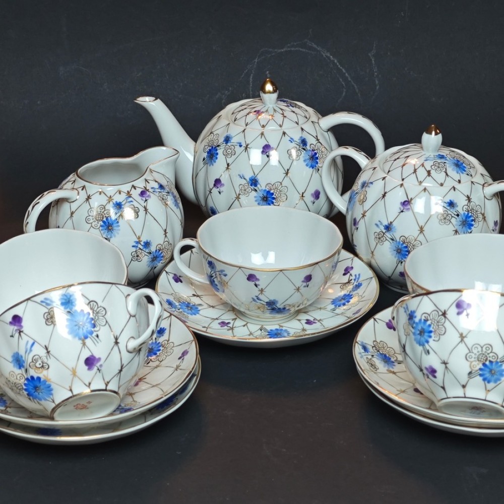 Tea service "Golden Mesh" (blue), 6 / 15, LFZ, USSR porcelain, 1970s.