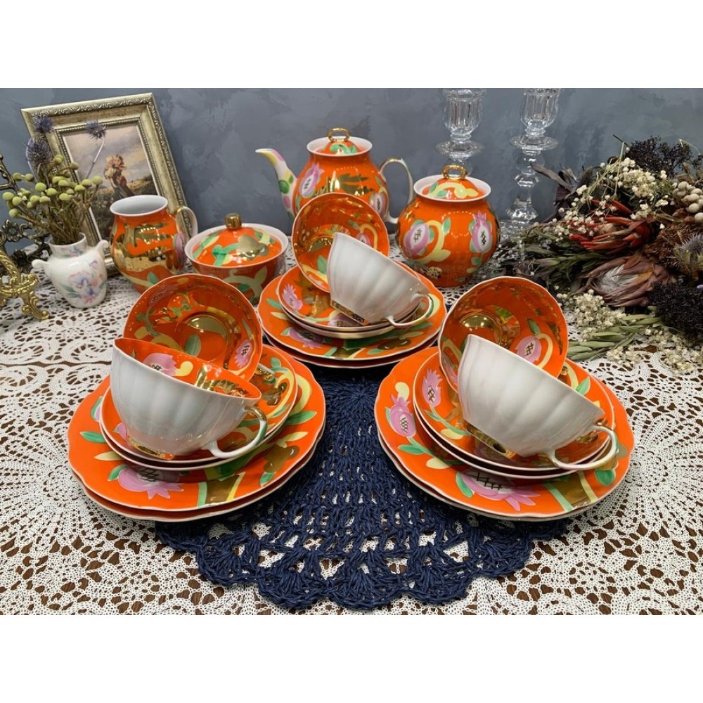 The service includes a teapot, sugar bowl, creamer, butter dish (a rare item), 6 teacups and saucers, and 6 plates (diameter 20 cm).