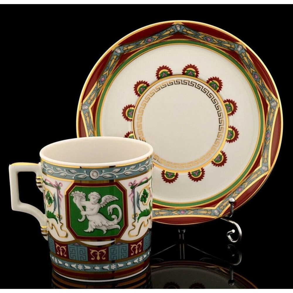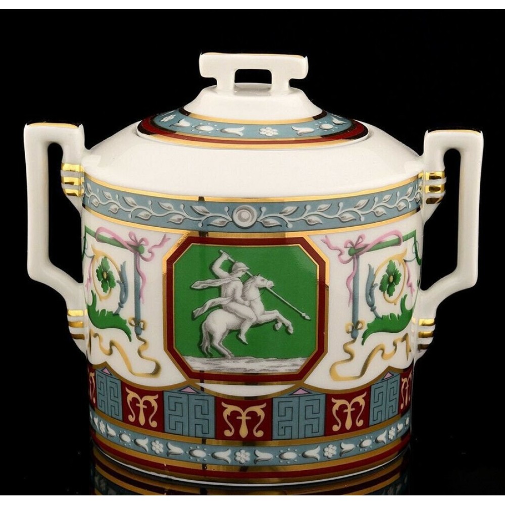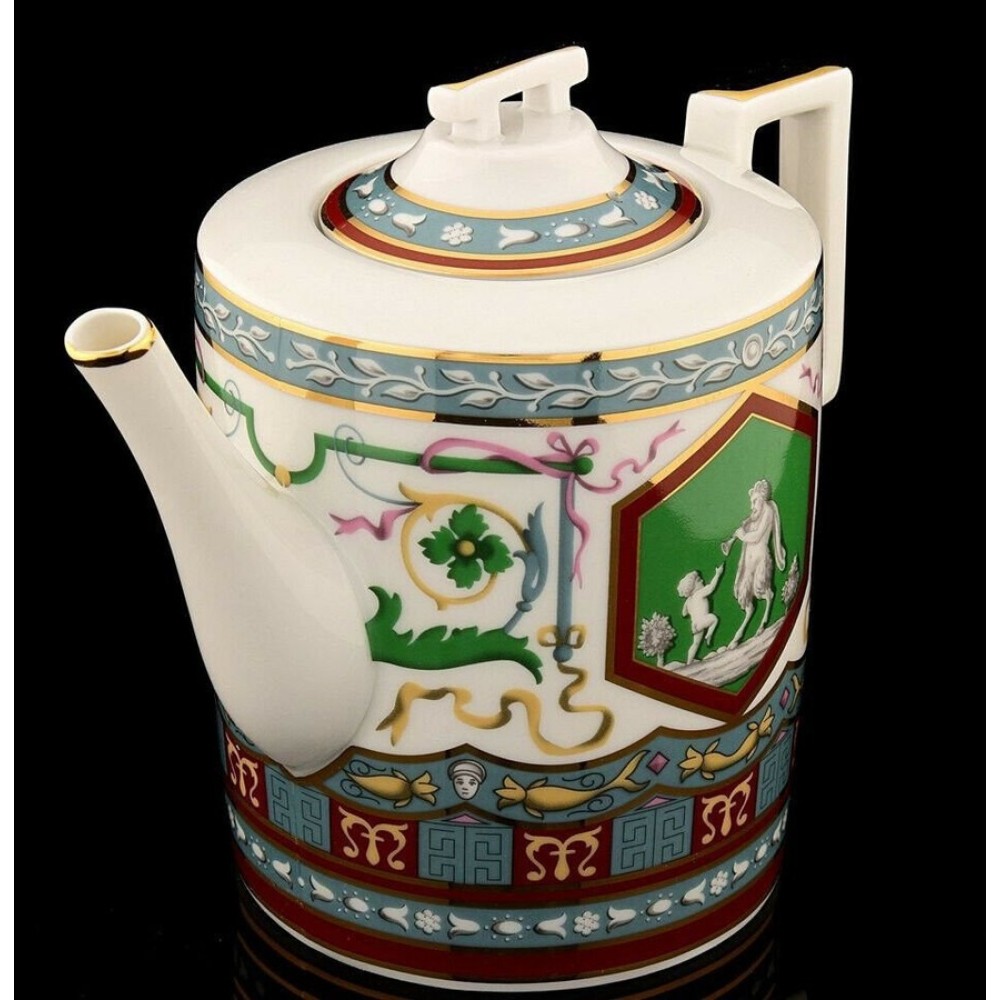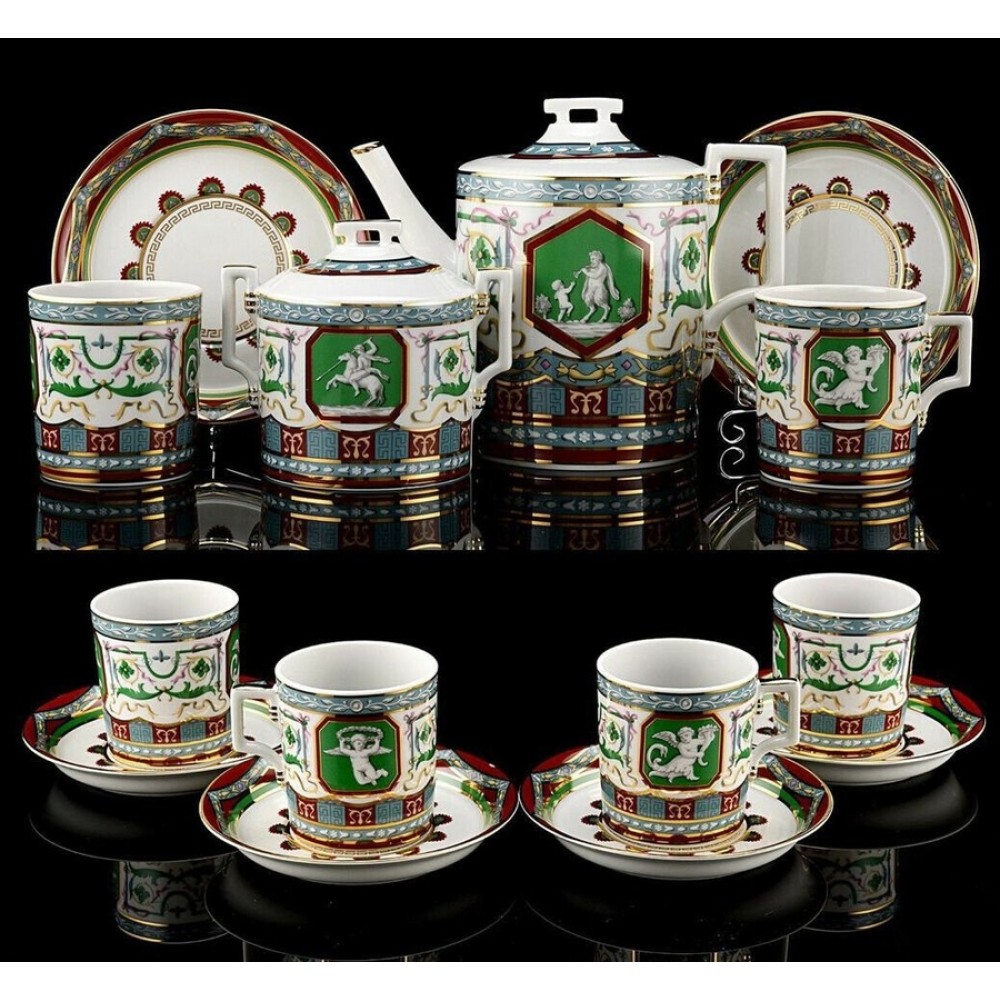 The service is based on the museum sample of the famous "Raphael" dining ensemble, which was ordered at the Lomonosov Porcelain factory in 1883 by Russian Emperor, Alexander III, and named after the ornament copied from the drawings of the famous gallery, built at the beginning of the 16th century in the Vatican in the Pope's palace according to the project of the architect D. Bramante. A copy of the famous paintings by Raphael, made at the direction of Catherine for the Hermitage, inspired many artists and masters of applied art. The final design of the service was developed and approved with the direct participation of the emperor. The rich ornamental decor included grotesque ornaments and medallions with allegorical images of grisaille. A special stamp was developed for the Raphael service: a large monogram of Emperor Alexander III in Slavic script, filled with gilding and red paint. The service was created over 20 years, and after completion of the work, already in 1904, it was delivered to the Anichkov Palace at the disposal of the Dowager Empress Maria Feodorovna. The Raphael service became the most ambitious work performed at the factory in the last quarter of the 19th century. Nowadays, the original design of the "Raphael" service was mastered by the masters of the plant in a modern form for a combined method of decoration and embodied in the "Antique" service. Each item is individual, color backgrounds, ornaments and subjects vary. The unity of the ensemble is communicated by the general composition of the decor and the color rhythm. The set for 6 persons includes a teapot, a sugar bowl, 6 cups, 6 saucers. The Teapot is approximately 5 1/2" ((14 cm), 1000 ml. The sugar bowl is approximately 4 1/4" (9.4 cm x 11cm). 400 ml. The cups are approximately 3 1/4" (8 cm), 220 ml. The saucers are approximately 5 1/2" (14.1 cm) in diameter. It was hand-painted. They have Imperial Lomonosov Porcelain Factory logo on the bottom. Brand new, never used, excellent condition, export quality. The Imperial Porcelain Factory (now known as the Lomonosov Porcelain Factory) was founded by Empress Elizabeth in 1744 in Saint Petersburg, Russia. Lomonosov Porcelain Factory was the first porcelain manufacturer in Russia to develop and commercially implement the alabaster porcelain technology. This fine delicate porcelain is a more brilliant white than the usual kind, and thin almost to the point of being translucent. From its first porcelain bear, hand-made by the inventor of Russian porcelain, Dmitry Vinogradov, Lomonosov has continued the tradition of creating life through porcelain. This quality, demanded by the Imperial Romanov Family, can still be found two and a half centuries later, when more than 300 different types of figurines are made at the factory for people throughout the world to enjoy. And every one of them is hand­made and hand-painted. It is this special attention to detail of Lomonosov artists which infuses each figurine with life, soul, individuality. Standards of excellence set by Lomonosov sculptors, such as B.Vorobyev, I.Riznich, P.Veselov received high international acclaim at World Exhibitions in Brussels, New York, London etc. Tea set form coat of Arms pattern Antique 6/14 Imperial porcelain tableware is an expensive decoration of the festive table. It combines elegance and lightness, refined appearance and high quality of the IFZ factory. Tea set coat of Arms shape Antique pattern made of solid porcelain The Imperial porcelain factory will not only decorate the table, but also bring a touch of solemnity and wealth to the interior. Author of the form - based on a Museum sample The author of the drawing is M. Yavein Type of drawing - decal teapot - 1 PC.(14 cm, volume 1000 ml.) sugar bowl - 1 PC.(9.4 x 11, weight 293 g, volume 400 ml) Cup - 6 PCs.(8 cm, volume 220 ml) saucer - 6 PCs.(diameter 14.1 cm ) Weight-2643 g Can be washed in the dishwasher. It is not recommended to use in a microwave oven. Our store offers fast delivery in 1 day in Moscow and St. Petersburg and 3-5 days in Russia. Buy a 14-piece armorial Antique Tea set from the Imperial porcelain factory and turn an ordinary tea party into a home-made tea ceremony. The service is based on the museum sample of the famous "Raphael" dining ensemble, which was ordered at the Lomonosov Porcelain factory in 1883 by Russian Emperor, Alexander III, and named after the ornament copied from the drawings of the famous gallery, built at the beginning of the 16th century in the Vatican in the Pope's palace according to the project of the architect D. Bramante. A copy of the famous paintings by Raphael, made at the direction of Catherine for the Hermitage, inspired many artists and masters of applied art. The final design of the service was developed and approved with the direct participation of the emperor. The rich ornamental decor included grotesque ornaments and medallions with allegorical images of grisaille. A special stamp was developed for the Raphael service: a large monogram of Emperor Alexander III in Slavic script, filled with gilding and red paint. The service was created over 20 years, and after completion of the work, already in 1904, it was delivered to the Anichkov Palace at the disposal of the Dowager Empress Maria Feodorovna. The Raphael service became the most ambitious work performed at the factory in the last quarter of the 19th century. Nowadays, the original design of the "Raphael" service was mastered by the masters of the plant in a modern form for a combined method of decoration and embodied in the "Antique" service. Each item is individual, color backgrounds, ornaments and subjects vary. The unity of the ensemble is communicated by the general composition of the decor and the color rhythm.