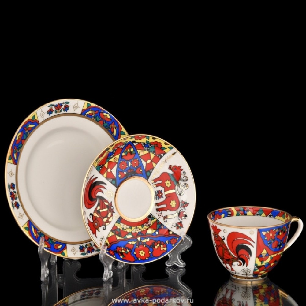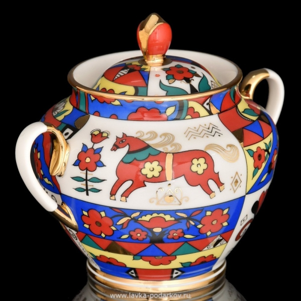 ✨ Juicy in color, emotionally rich painting reflects the joy of the outlook of a cheerful folk carousel with figures of horses, roosters, fairy birds and outlandish flowers of a fairground booth. In 1958, at the World Exhibition in Brussels, the authors of this teapot set were awarded gold medals. The service is in the collection of the State Hermitage. Hand painted with overglaze paints and gold.
