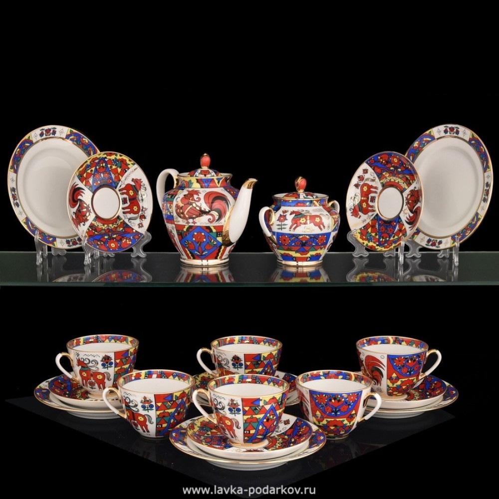 Folk Carousel Unique Tea Set 6/20 Russian Lomonosov Porcelain Vorobyevsky