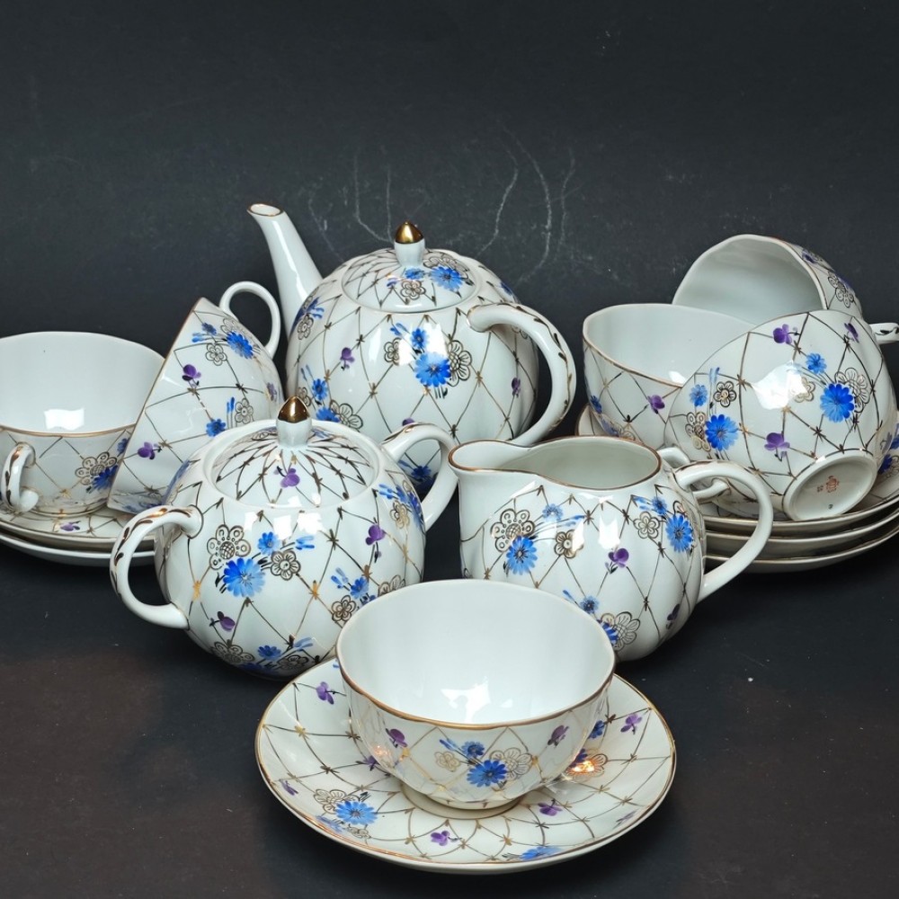 Vintage Tea Set Golden Net Lomonosov Porcelain (LFZ) Made in USSR 1960 This elegant porcelain tea set with a magnificent original design will complement any meal - whether it is an ordinary tea party with friends or a holiday feast. The tea set was made at the legendary Lomonosov Porcelain Factory, which was opened in the second half of the 18th century, in accordance with the old production methods of the company. A unique recipe for each type of porcelain was developed by the scientist Dmitry Vinogradov back in the 18th century for the Elizabethan Porcelain Manufactory (now the Imperial Porcelain Factory). A practical gift option for a general or personal holiday. The set for 6 persons includes a teapot, sugar bowl, 6 cups, 6 saucers, 6 cake plates. The Teapot is approximately 6" (13 cm) tall, 600 ml. The sugar bowl is approximately 4 1/4" (11.5 cm) tall (with lid). The cups are approximately 2 3/4" (6 cm) tall and 4" (10.5 cm) in diameter. The saucers are approximately 6" (15 cm) in diameter. The plates are 7" (18 cm) in diameter. It was hand-painted with Gold Ink. They have Imperial Lomonosov Porcelain Factory LFZ logo on the bottom. Brand new, never used, excellent condition, export quality. The Imperial Porcelain Factory (now known as the Lomonosov Porcelain Factory) was founded by Empress Elizabeth in 1744 in Saint Petersburg, Russia. Lomonosov Porcelain Factory was the first porcelain manufacturer in Russia to develop and commercially implement the alabaster porcelain technology. This fine delicate porcelain is a more brilliant white than the usual kind, and thin almost to the point of being translucent. From its first porcelain bear, hand-made by the inventor of Russian porcelain, Dmitry Vinogradov, Lomonosov has continued the tradition of creating life through porcelain. This quality, demanded by the Imperial Romanov Family, can still be found two and a half centuries later, when more than 300 different types of figurines are made at the factory for people throughout the world to enjoy. And every one of them is hand­made and hand-painted. It is this special attention to detail of Lomonosov artists which infuses each figurine with life, soul, individuality. Standards of excellence set by Lomonosov sculptors, such as B.Vorobyev, I.Riznich, P.Veselov received high international acclaim at World Exhibitions in Brussels, New York, London etc. Pictures are part of the description and reflect the current state of the article. The real color of the item may be slightly different from the pictures shown on website caused by many factors such as brightness of your monitor and light brightness. We ship via registered airmail with the tracking number.