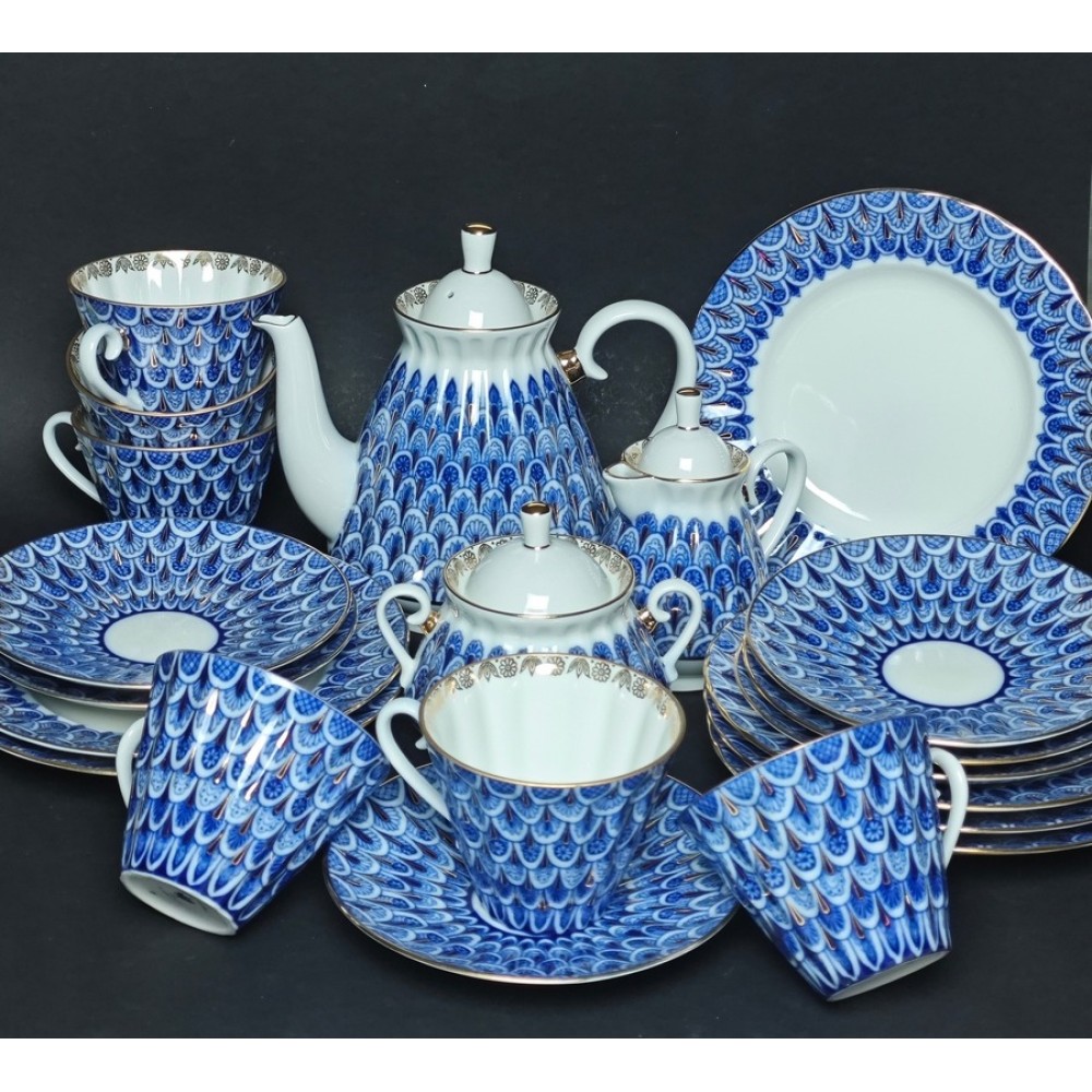 The service was manufactured at the Imperial Porcelain Factory from hard porcelain. Underglaze decals were used for decoration, with gold hand-painted accents. The form and design are by Nina Slavina. Production of the item began in the 1970s. The service comprises 15 pieces: teapot, sugar bowl, cream pitcher, 6 cups (235 ml), 6 saucers.
