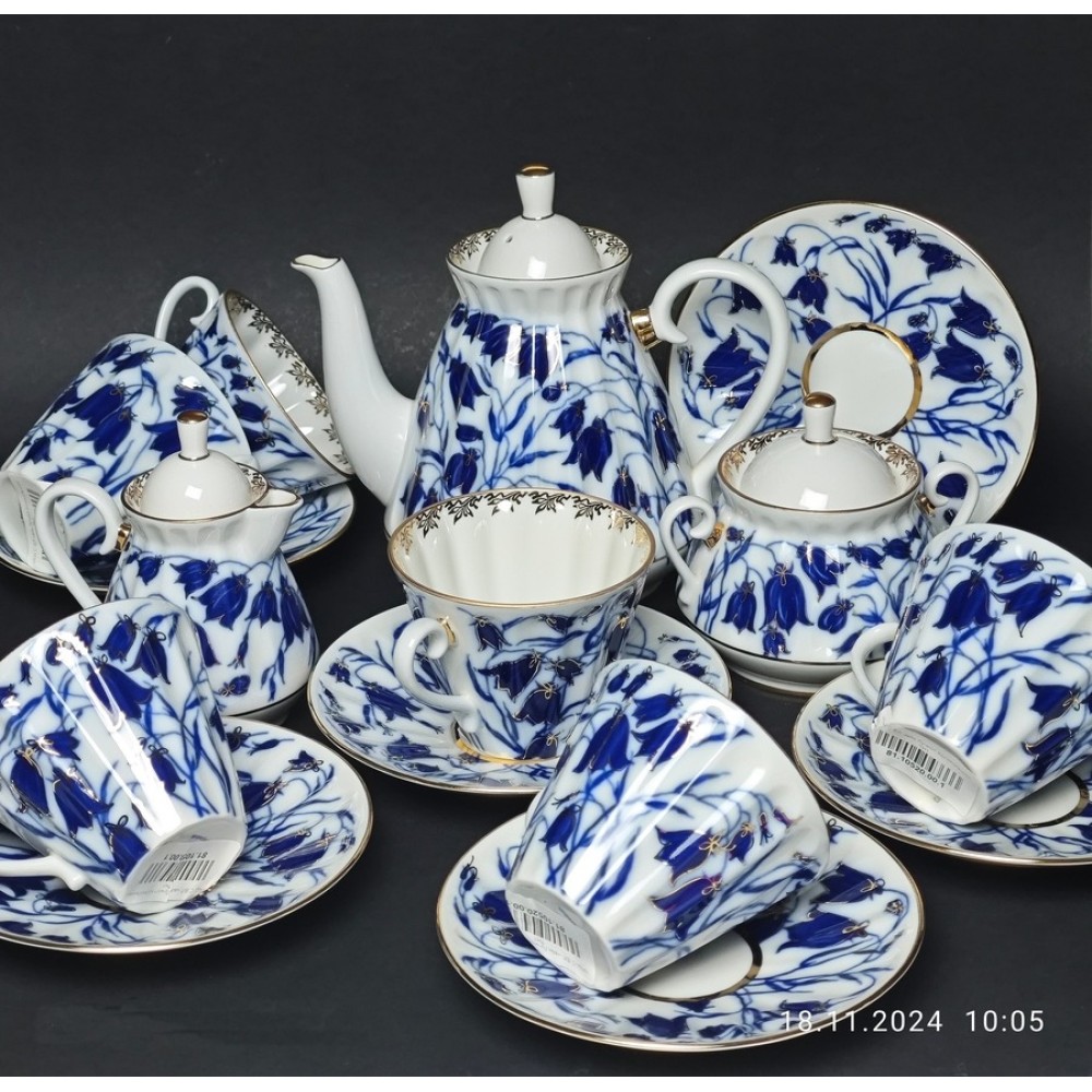 Tea service "Radiant Bells," 6/15 The service is made of hard porcelain. The decoration utilizes underglaze decals and gold hand-painted accents. The form and design are by Nina Slavina. Production of the item began in the 1970s. The service includes 15 pieces: teapot, sugar bowl, creamer, 6 cups (235 ml), 6 saucers. The photographs show hallmarks on the cups as IFZ, and on the teapot, sugar bowl, and creamer as LFZ. Priority is given to selling the complete set as shown. However, I may consider offers for individual pieces. I have another service, 6/14 with IFZ hallmarks, not assembled, and without a creamer. Both services are in new, excellent condition.