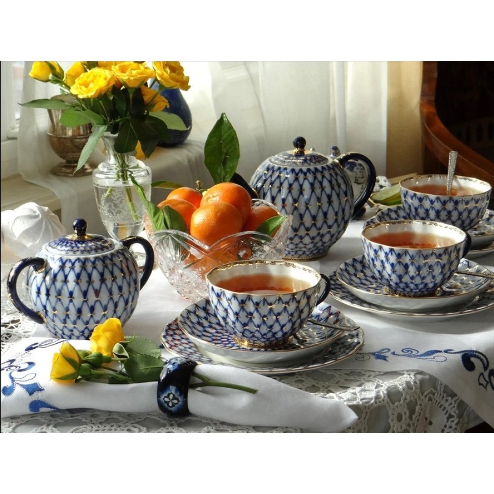 This elegant 22K Gold Cobalt Net porcelain tea set with a magnificent original design will complement any meal - whether it is an ordinary tea party with friends or a holiday feast. A tea set with a hand-molded body of solid, non-porous porcelain. The designs on its surfaces are made with the decal technique, which involves applying a pattern to a porcelain surface from a paper sheet, using gold-based super-paint and cobalt oxide.