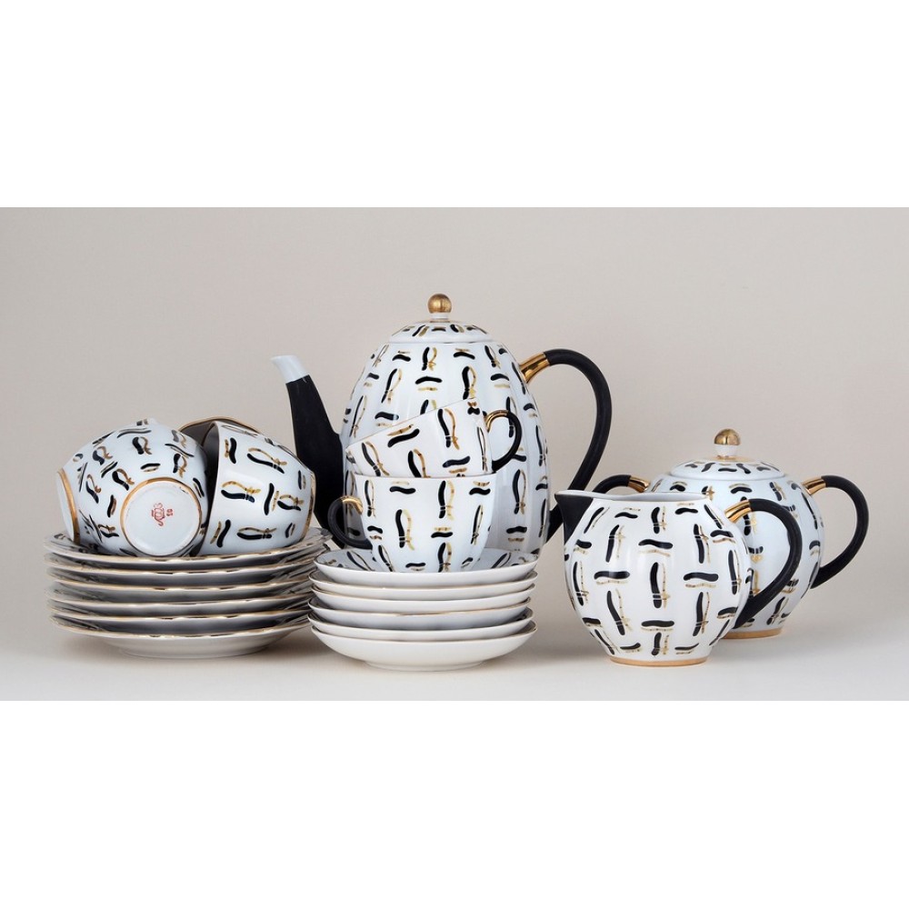The set for 6 persons includes a tea pot, sugar bowl, milk jug, 6 cups, 6 saucers, 6 cake plates.