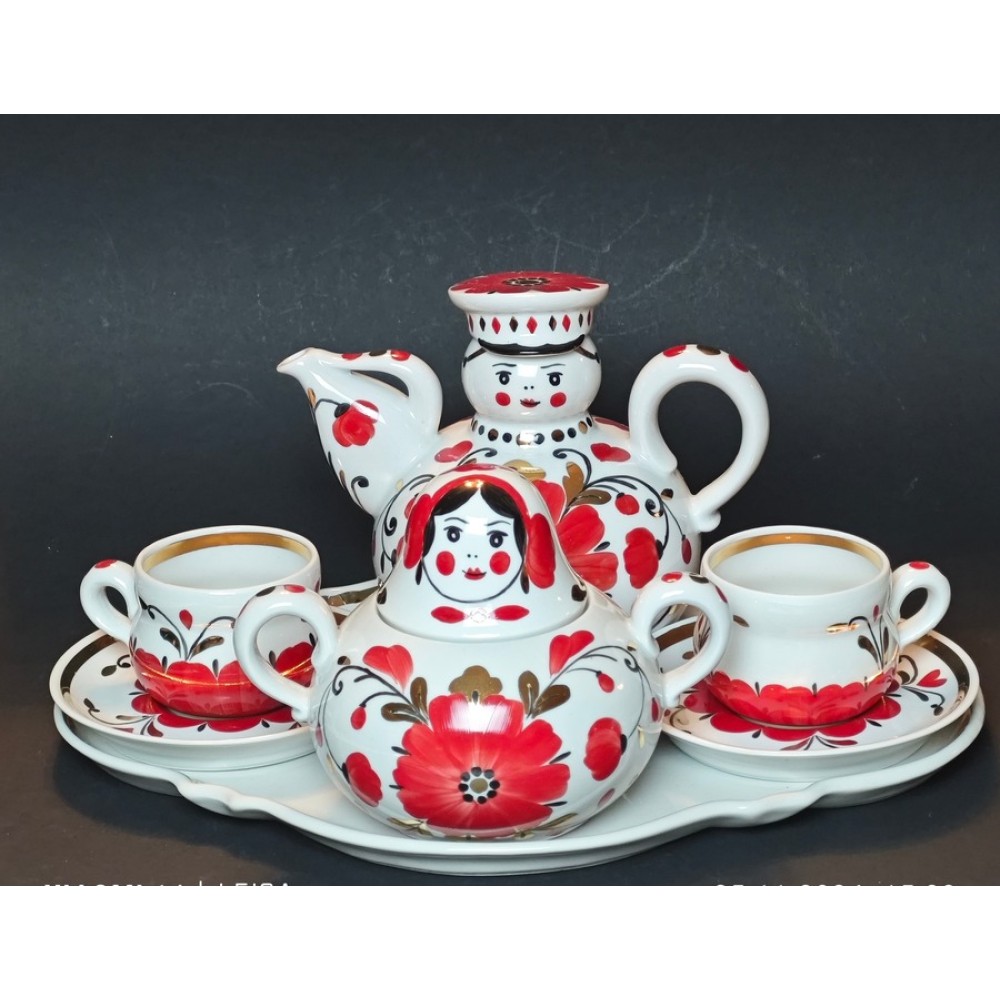Teapot with a domed lid and sugar bowl with a nesting doll-style cover, along with two cups and saucers. All presented on a serving tray. HAND-PAINTED! The form’s author is Honored Artist of the RSFSR Yu.B. Ganrio. Painting by A.A. Gorkova. Teapot – 1 pc., volume 650 ml. Sugar bowl – 1 pc., volume 500 ml. Cup – 2 pcs., volume 120 ml. Saucer – 2 pcs. Serving tray – 1 pc., 32.5 x 24 cm. Condition: "New," without chips or cracks.