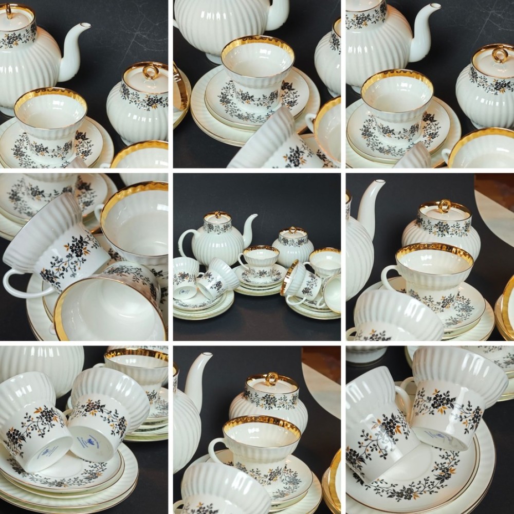 The service comprises 20 pieces: teapot, sugar bowl, 6 cups (155 ml), 6 saucers, 6 dessert plates.