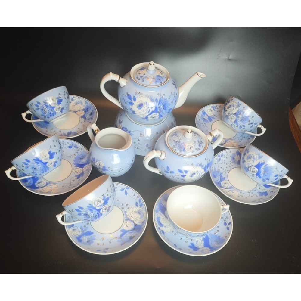 Antique Blue Peony Teaservice 6/16, Dulevo, USSR porcelain, 1959.