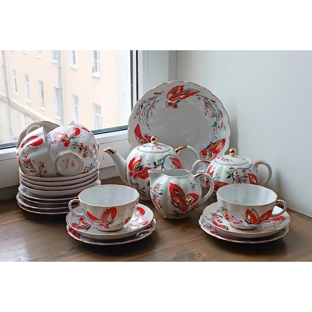 Vintage "Butterflies" tea set, Tulip form, LFZ, USSR porcelain.