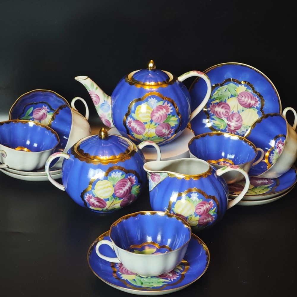 A RARETY FOR A COLLECTION The service includes 15 pieces: teapot, sugar bowl, creamer, 6 cups (8.5 oz), 6 saucers. The service is made of the finest snow-white porcelain, with an even blue glaze, abundant gilding, and hand-painted decoration. The renowned Dulevo "Krasavitsa" (Beauty) was created for the Paris Exhibition of 1937 and intended as a work celebrating the beauty of the Russian woman. Many iconic Dulevo paintings from the Soviet period are the work of the factory’s chief artist, Pyotr Vasilyevich Leonov. Leonov received the Grand Gold Medal at the World's Fair in Paris for the Krasavitsa service. The famous "Krasavitsa" service is considered a classic. During the Soviet era, it could be found in the display cabinets of many city apartments. Drawing author - P.V. Leonov, Honored Artist of the RSFSR. Form author - S.E. Yakovleva, Honored Artist of the RSFSR. Hand-painted and decorated with 24-karat gold.