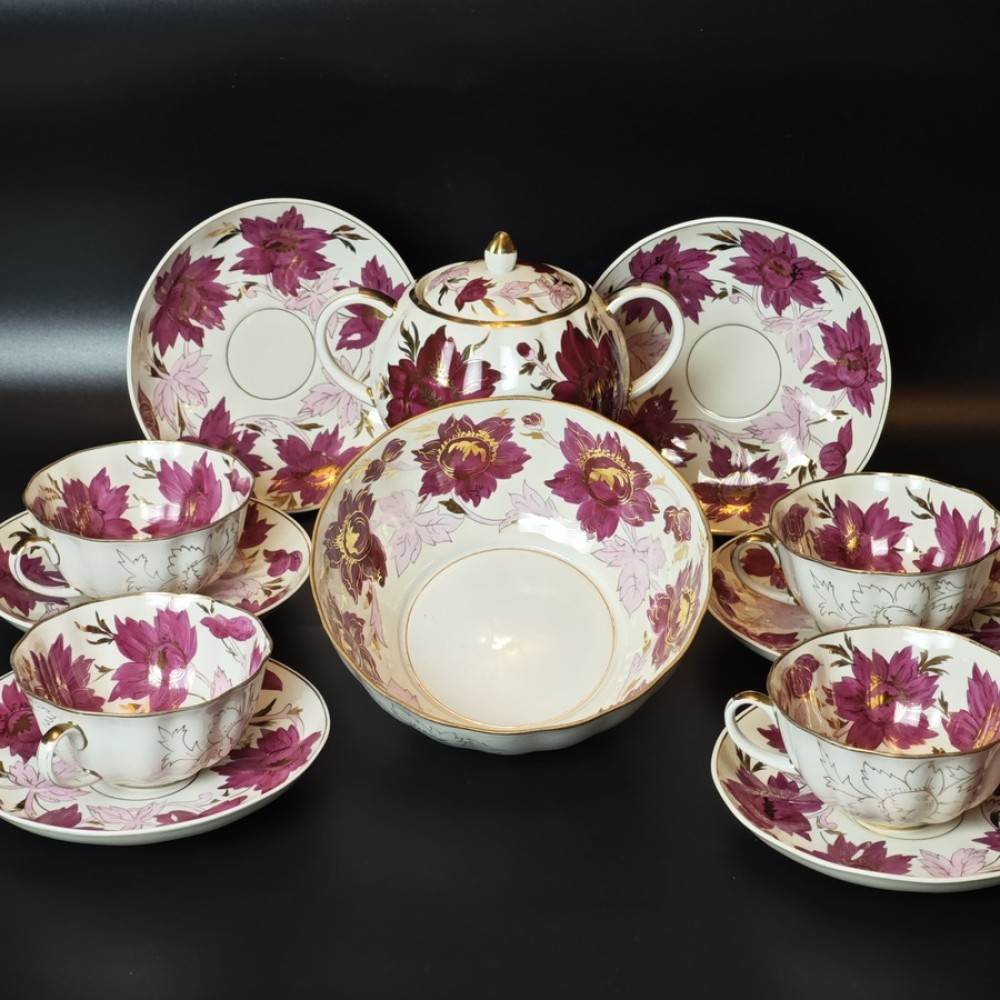 Vintage "Raspberry Tulip" (Raspberry Flower) tea set, Dulevo, 1956.