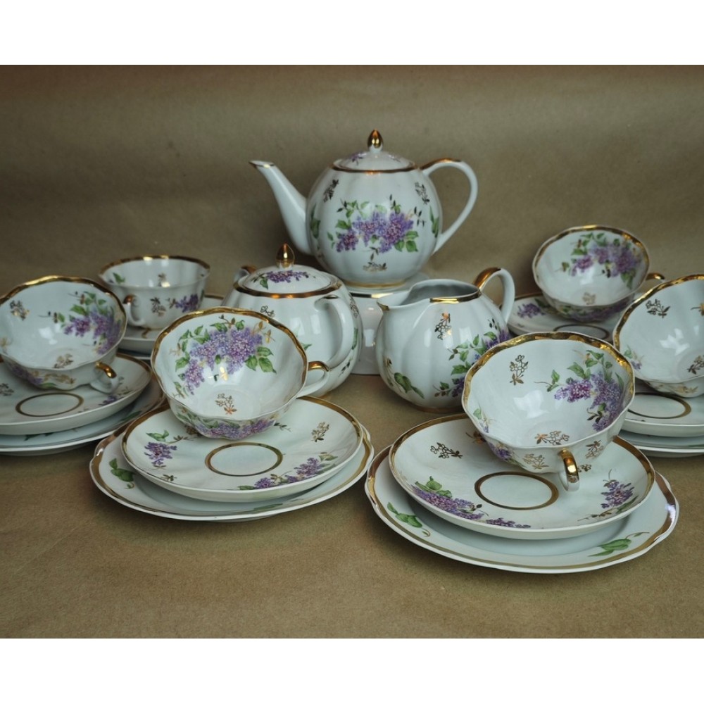 Dulevo Lilac Service with a flower on the bottom, 6/16, USSR porcelain, 1957.