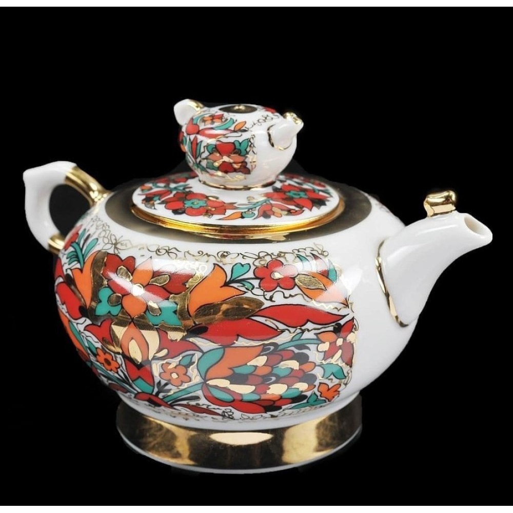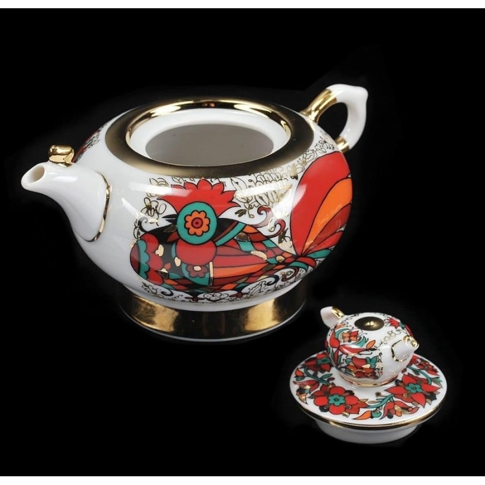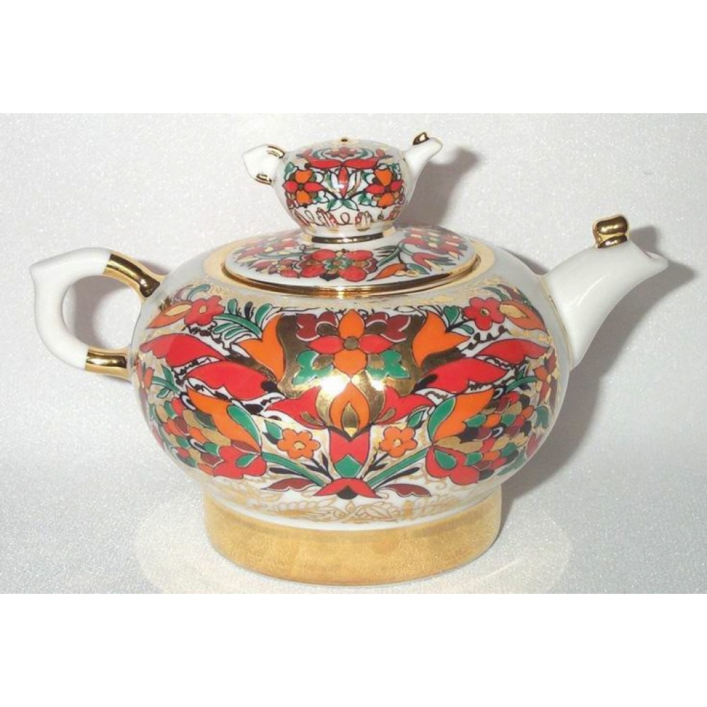 The tea pot - decoration Golden Cockerels,form Semeyni (family form), hand enamel painting with gold. For the first time wonderful pattern of this teapot created at the Lomonosov Porcelain Factory in St. Petersburg by Alexei Vorobyevski, porcelain painter and Eduard Krimmer, modeler in 1972.