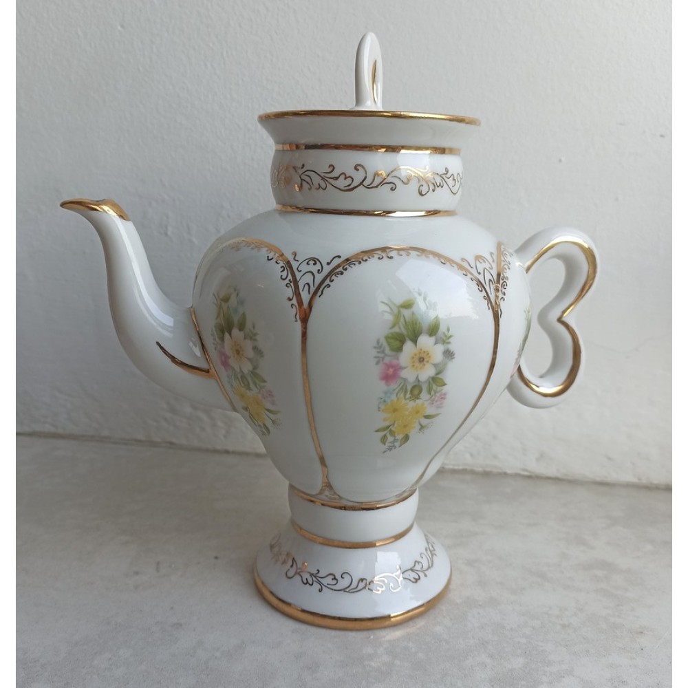 The teapot was made at the Lomonosov Porcelain Factory from hard porcelain. The form was hand-modeled. Hand-applied overglaze decoration is used for embellishment. The form’s designer is Tamara Bespalova-Mikhaleva. Production of the item began in 1978. Capacity – 480 ml, height – 18.4 cm.