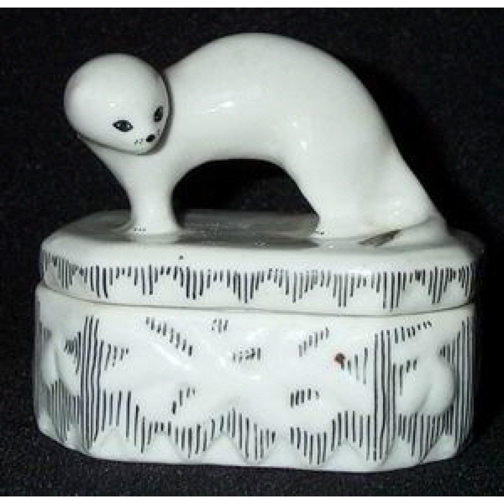 Wonderful box was made at the Porcelain Factory in USSR. 3 1/4 inch. tall and 3 inch. long. It is in excellent condition. It has a factory monogram on the bottom.