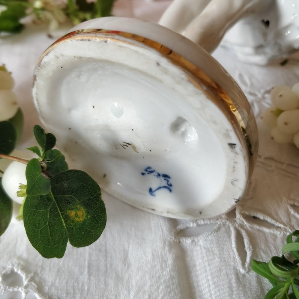 Wonderful figurine was made at the former Kornylov Porcelain factory in St-Petersburg, Russia. The Kornyloff factory, started in 1835 by two brothers of a merchant family in Petersburg, engaged skilled artists and crafts men from the Imperial, Gardner, and Popov factories. It quickly acquired a reputation for artistic excellence, and as early as 1839 won a gold medal at the Moscow ceramic exhibition. The owners spared no expense and trouble to bring their products to perfection, and for this purpose commissioned original drawings from leading artists of the day. The gorgeous colouring, rich gilding, and decorative finesse of Kornyloff products soon became well known, and they were sought after by collectors. In the last decades of the nineteenth century this factory started mass production of cheap porcelain wares for export. After the October Revolution of 1917 the factory was nationalised and renamed LZFI. It is in excellent condition, no chips, no cracks. 9 1/2 inch. tall. It has a factory monogram on the bottom.