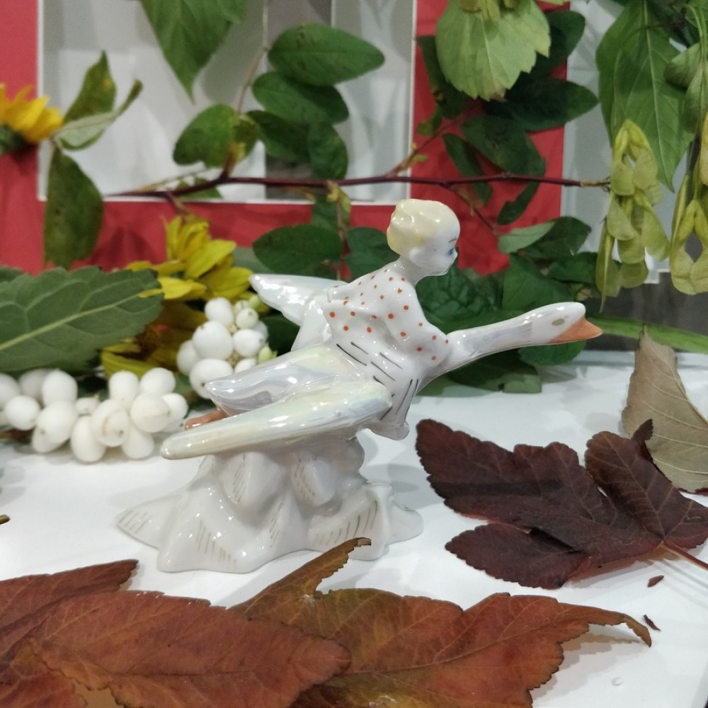 The figurine has the motif of the Russian fairy tale - "Geese-swans" A man lived with his wife in a village. They had a daughter and a son who was still quite small. One day the mother said: inch. Daughter, we are going to work now. Look after your little brother. Don't leave the yard and if you are a good girl we will buy you a shawl. inch. The mother and father went off and soon the girl forgot what she had been told. She sat her little brother down on the grass in the yard, and went out into the street where she got so involved in a game that she wandered farther and farther from home. Geese flew in, grabbed the boy and carried away on the wings. . Like all good stories this fairy tale has a happy ending... Wonderful figurine was made at the former Kornyloff Porcelain Factory in St-Petersburg, Russia. The Kornyloff factory, started in 1835 by two brothers of a merchant family in Petersburg, engaged skilled artists and crafts men from the Imperial, Gardner, and Popov factories. It quickly acquired a reputation for artistic excellence, and as early as 1839 won a gold medal at the Moscow ceramic exhibition. The owners spared no expense and trouble to bring their products to perfection, and for this purpose commissioned original drawings from leading artists of the day. The gorgeous colouring, rich gilding, and decorative finesse of Kornyloff products soon became well known, and they were sought after by collectors. In the last decades of the nineteenth century this factory started mass production of cheap porcelain wares for export. After the October Revolution of 1917 the factory was nationalised and renamed LZFI. It is in excellent condition, no chips, no crack. 13 x 9 cm (4 3/4" x 3 1/2")