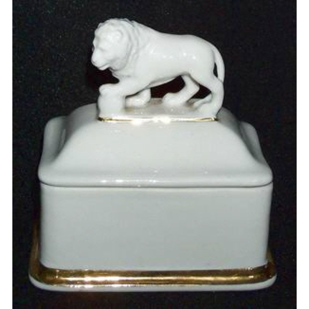 3 1/2 inch. x 2 1/2 inch. x 4 1/2 inch. tall with lion. Condition is excellent and I do not see any damage anywhere. It has a factory monogram on the bottom.