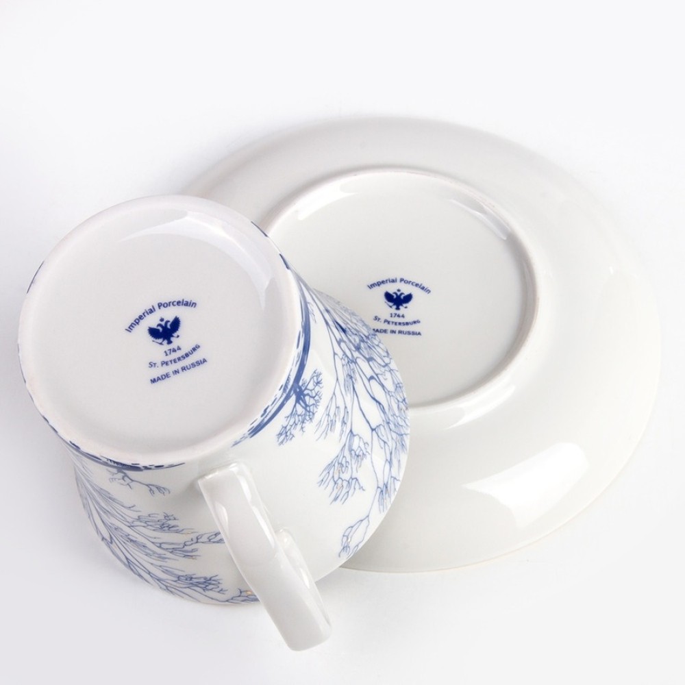 It was made in the Lomonosov Porcelain Factory in St. Petersburg, Russia former Soviet Union. The mug is approximately 4 inch. tall. The saucer is approximately 5 inch. in diameter. It has Lomonosov Porcelain Factory (LFZ) logo on the bottoms. Hand - painted with 22 Karat Gold Ink. Brand new, excellent condition, the export quality.