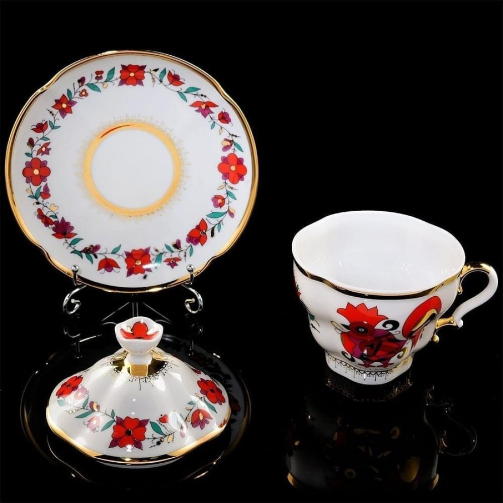 Teacup with lid and saucer, it can be as tea maker and tea cup. It's convenient to use when you want to drink tea. It was made in the Lomonosov Porcelain Factory in St. Petersburg, Russia, former Soviet Union. This pattern is named Red Rooste. It was hand-painted by Gold Ink. The cup is approximately 5 inch. tall (with lid) and 3 3/4 inch. in diameter. The saucers is 5 3/4 inch. in diameter. It has a Lomonosov Porcelain Factory (LFZ) logo on the bottom.Brand new, excellent condition.