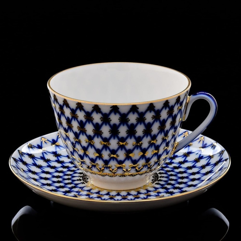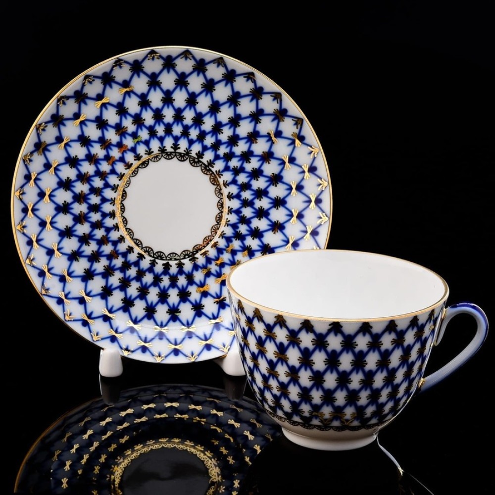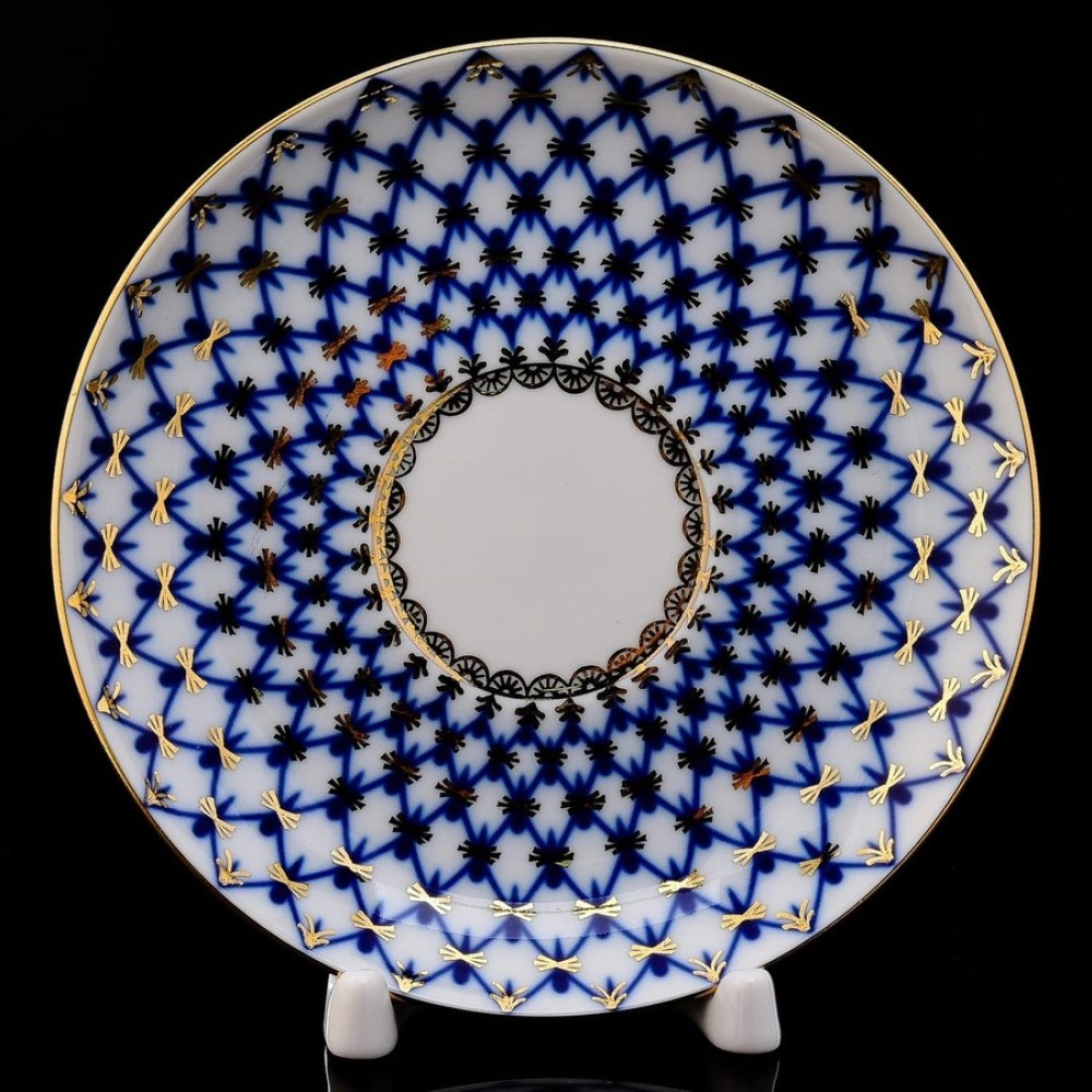 This is the famous Russian Lomonosov Gold Cobalt Net pattern, also known as the Catherine the Great pattern. These beautiful pieces are decorated with the Gold Cobalt Net design that originated in Russia two centuries ago when it was first made for the Czar's Winter Palace in St. Petersburg. It is unique for its deep blue color accented with gold where each Blue Net line intersects.