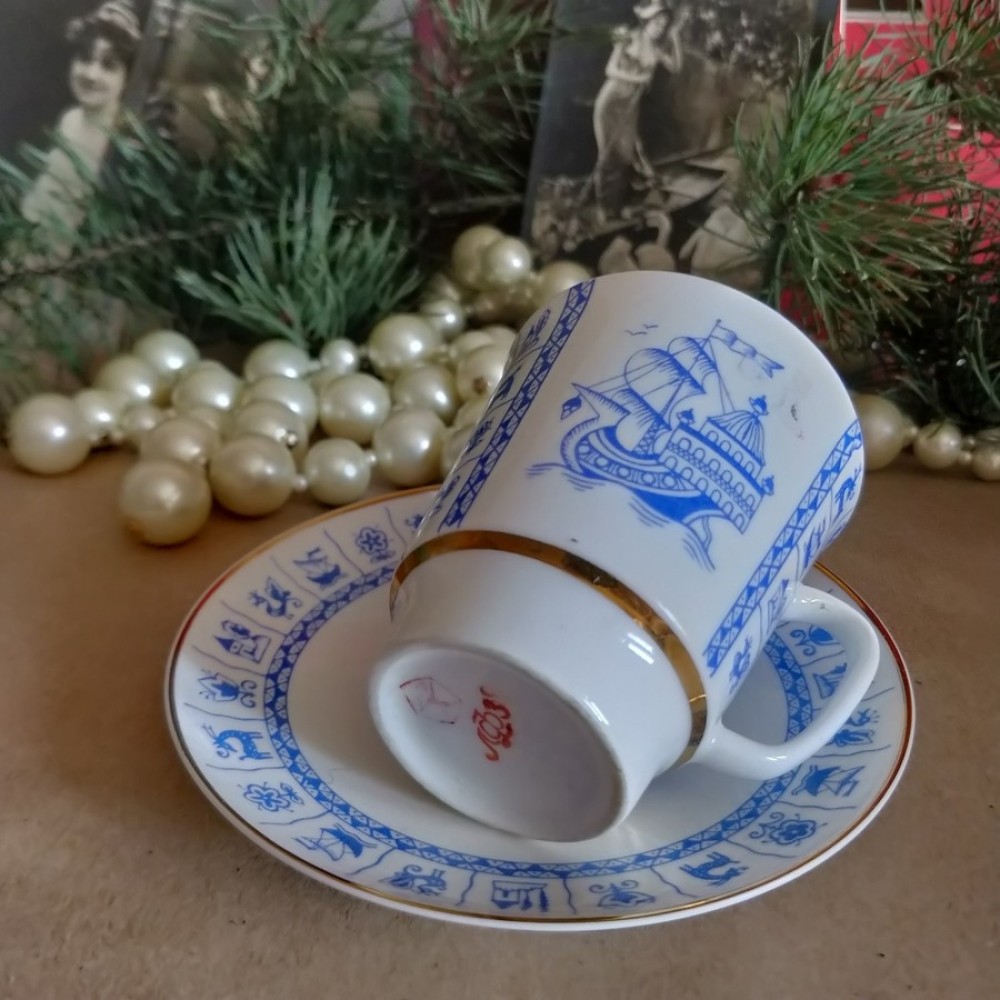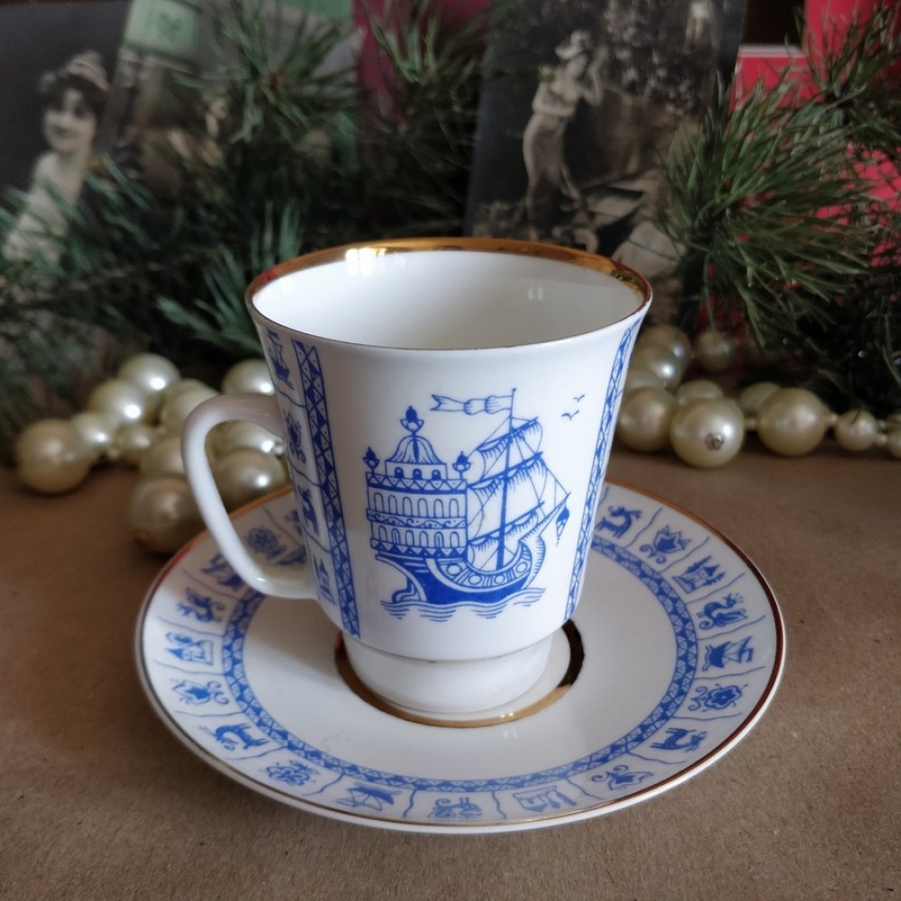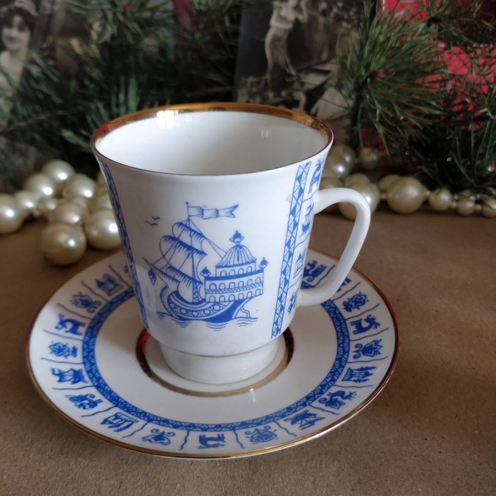 Bone china Cup and Saucer "Forget-Me-Not" Lomonosov porcelain Made in USSRBone china cup and saucer was made in USSR in the Lomonosov Porcelain Factory. It has the USSR Lomonosov Porcelain Factory logo on the bottom. Used, in excellent condition.