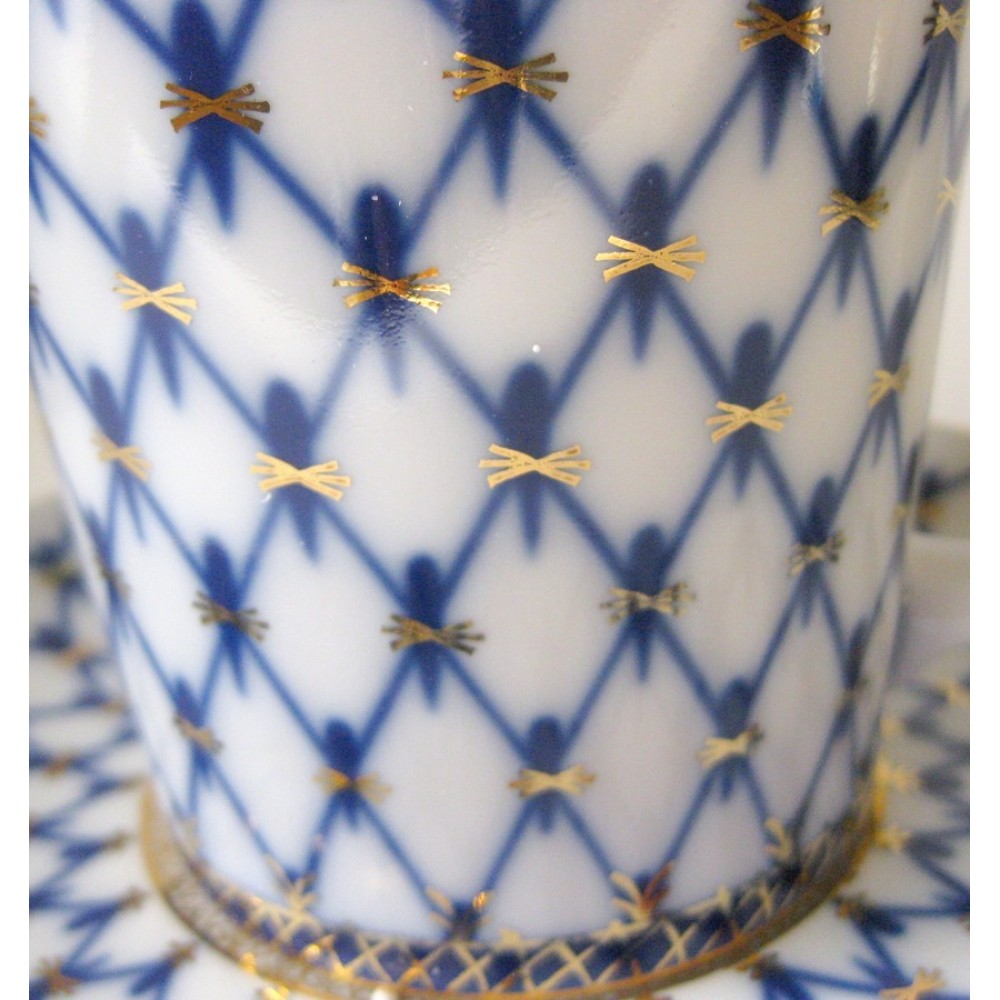The famous Russian Lomonosov Gold Cobalt Net pattern, also known as the Catherine the Great pattern. This beautiful piece is decorated with the famous Gold Cobalt Net design that originated in Russian two centuries ago when it was first made for the Czar's Winter Palace in St. Petersburg. It is unique for its deep blue color accented with gold where each Blue Net line intersects.