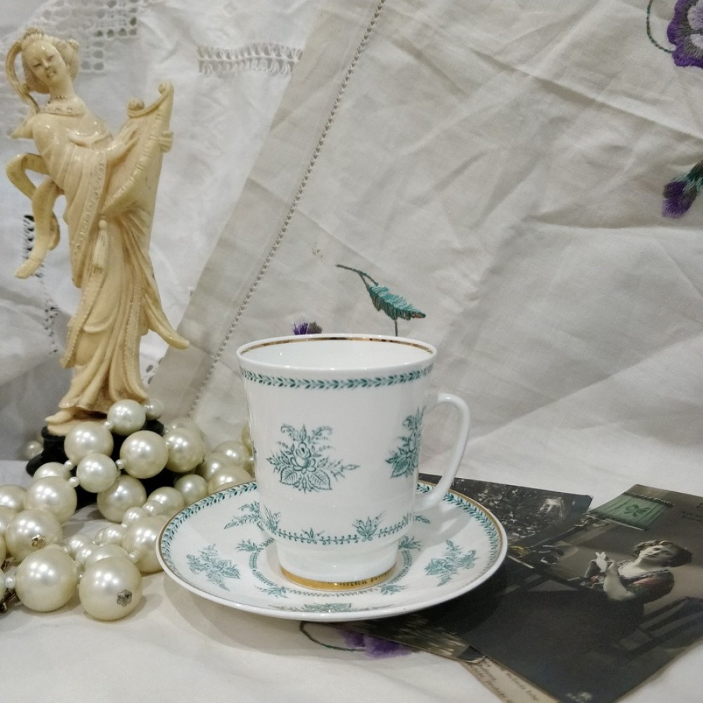 Bone china Cup and Saucer "Green Rhapsody" Lomonosov porcelain Made in USSRBone china cup and saucer was made in USSR in the Lomonosov Porcelain Facto