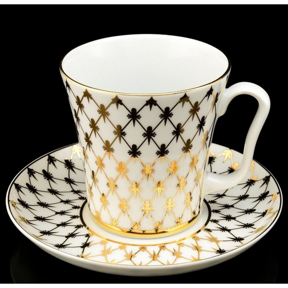 It was made in the Lomonosov Porcelain Factory in St. Petersburg, Russia, former Soviet Union. It was hand-painted with Gold Ink.The mug is approximately 4" (10 cm) tall. The saucers is 5" (12 cm) in diameter. It has a Lomonosov Porcelain Factory (LFZ) logo on the bottom.Brand new, excellent condition, never used the export quality.