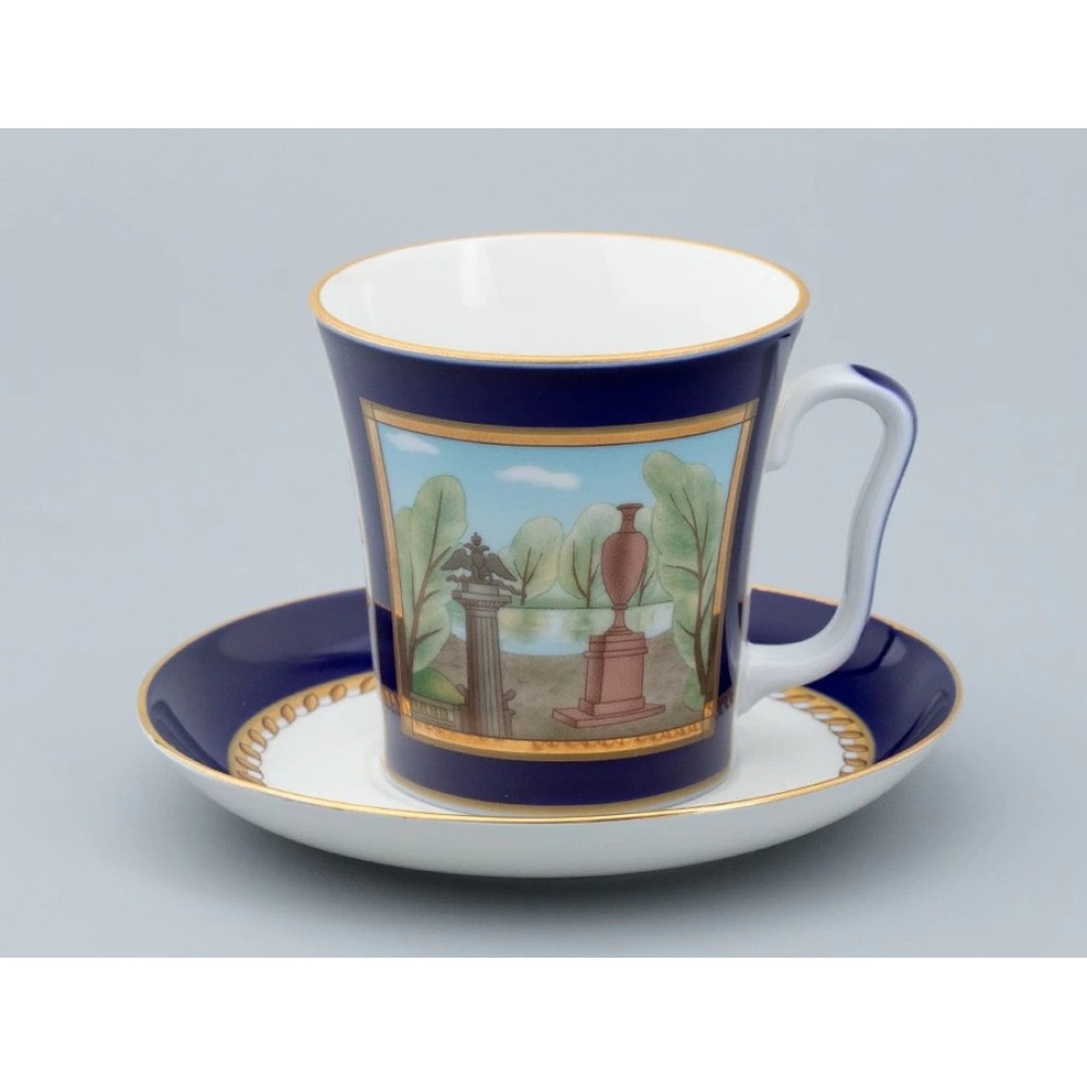 The cup and saucer were crafted at the Imperial Porcelain Factory from hard porcelain. The design is by Galina Shulyak, the form by Eduard Krimmer. The cup’s volume is 360 ml, with a height of 9.5 cm. Porcelain, underglaze monochrome decoration, overglaze polychrome decoration, and gilt accents. The “Porcelain Vase” cup and saucer are part of a porcelain series created by Honored Artist of the Russian Federation Tatiana Afanas’eva to commemorate the 320th anniversary of Saint Petersburg. The cup depicts a landscape of the Summer Garden featuring a Porfiry or Elfendal vase located near Karpiev Pond. Made at the Royal Manufactory of Elfdal, the vase was presented as a gift to Emperor Nicholas I by King Charles XIV John of Sweden. In the decoration, the artist intentionally utilizes vibrant cobalt and frames the landmark in gold, drawing a parallel with Galina Shulyak’s outstanding “Classics of Saint Petersburg” collection.
