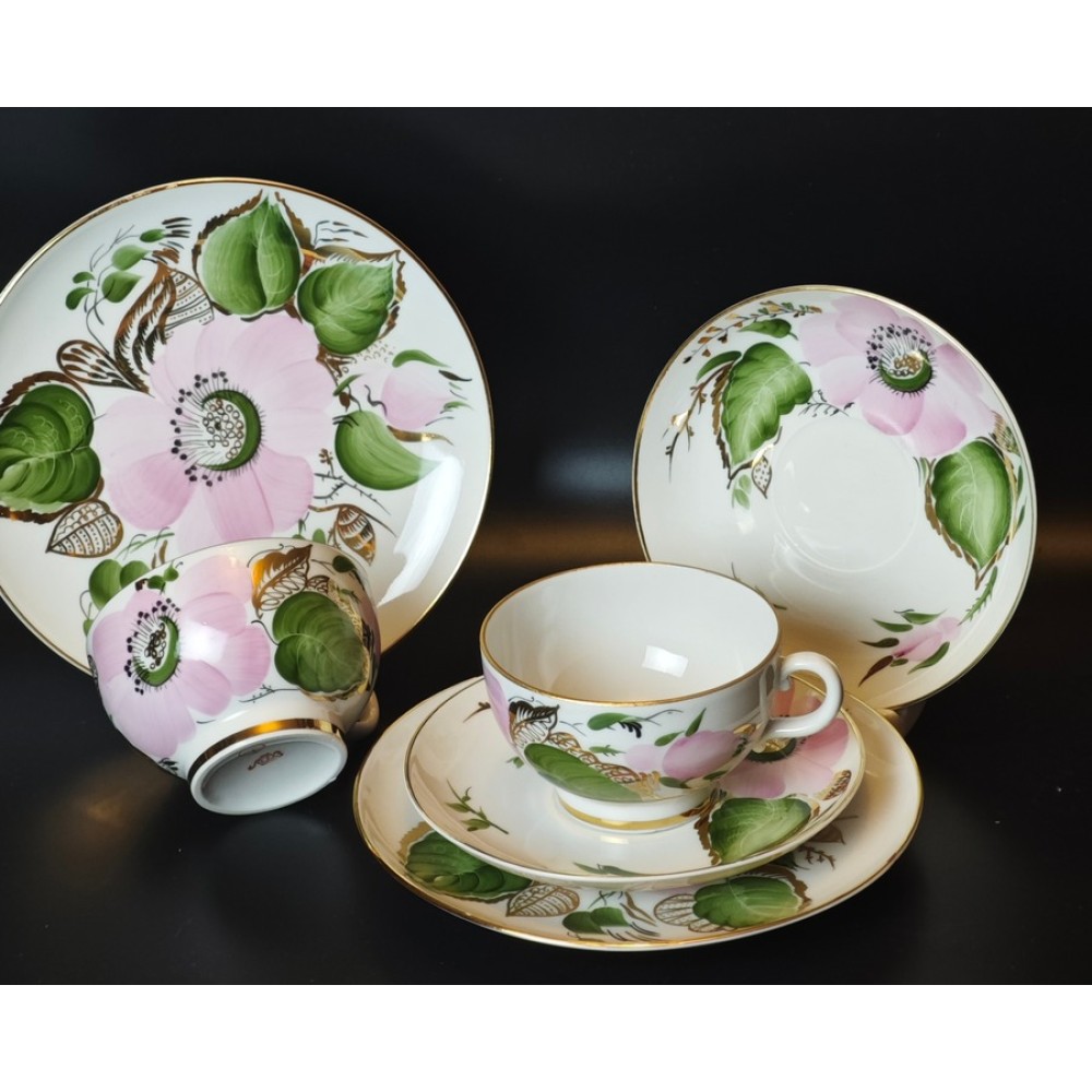 Vintage "Malva" tea cup and saucer with dessert plate, LFZ, USSR porcelain, 1960.
