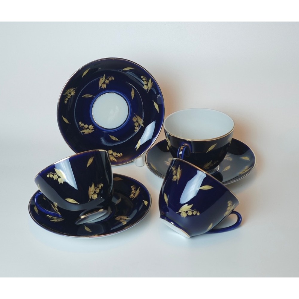 Vintage "Lily of the Valley Golden" teacup set, 1960s, LFZ, USSR porcelain.