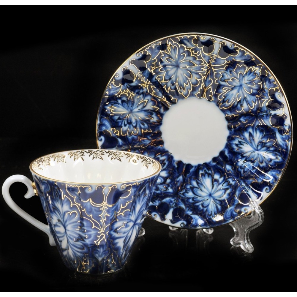 It was made in the Lomonosov Porcelain Factory in St. Petersburg, Russia, former Soviet Union. This pattern is named Heath-Cocks, designed by N. Slavina, porcelain artist. The set has a Radial shape, designed by N. Slavina. It was hand-painted by Cobalt with Gold 22 K Ink. The saucer is 6 inch. in diameter and cup is 3 inch. tall. They have Lomonosov Porcelain Factory LFZ logo on the bottom. Brand new, excellent condition, the export quality.